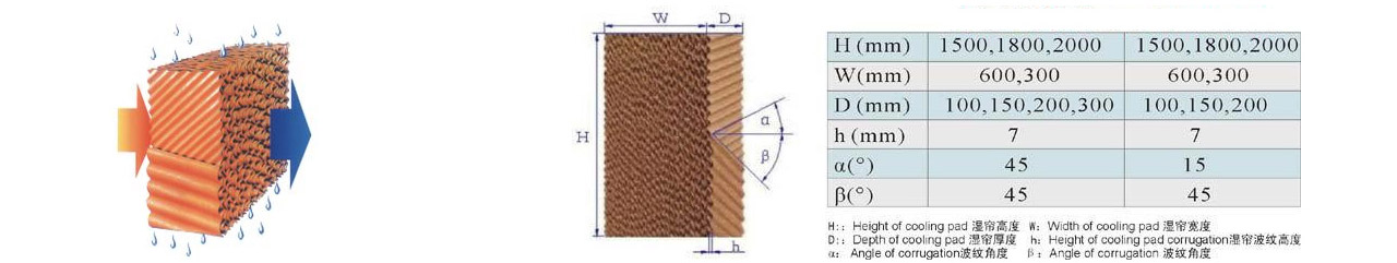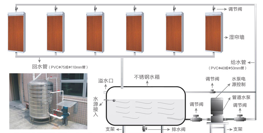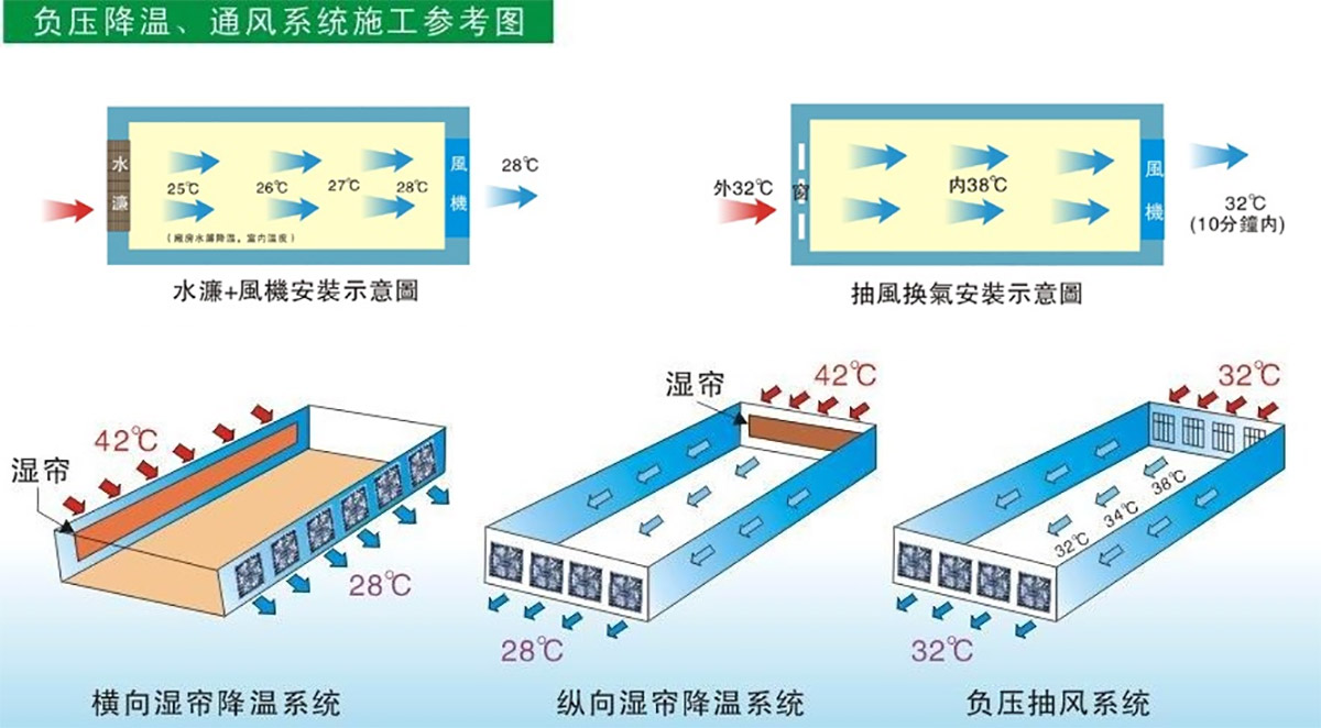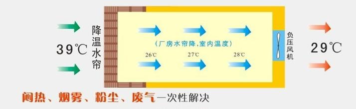 濕簾裝在密閉房舍一端山墻或側(cè)墻上,風(fēng)機(jī)裝在另一端山墻或側(cè)墻上,降溫風(fēng)機(jī)抽出室內(nèi)空氣,產(chǎn)生負(fù)壓迫使室外的空氣流經(jīng)多孔濕潤(rùn)濕簾表面時(shí),使空氣中大量熱量進(jìn)行轉(zhuǎn)化處理從而迫使進(jìn)入室內(nèi)的空氣降低10-15℃,并不斷的引入室內(nèi)進(jìn)行防暑降溫。